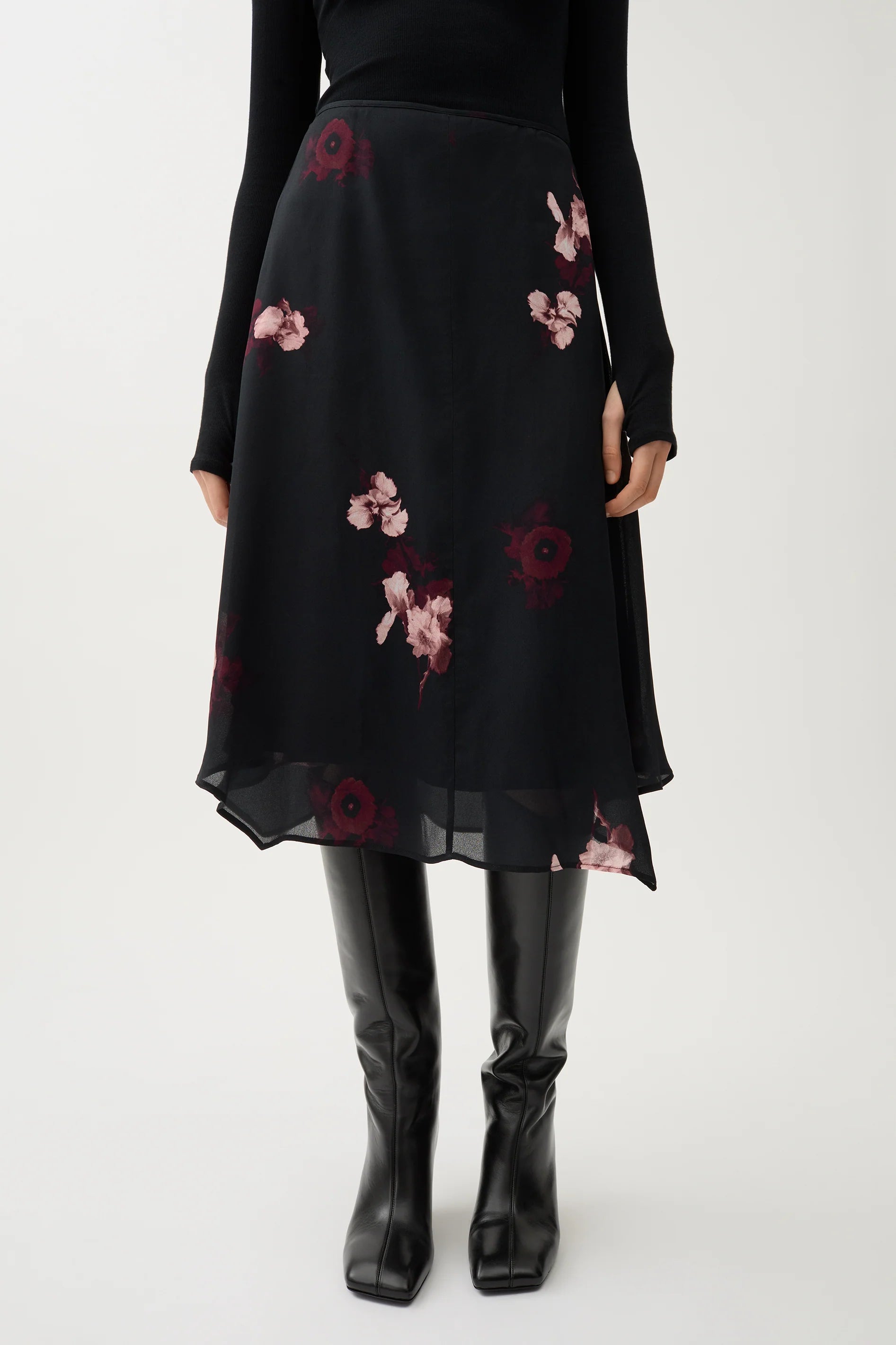 Amalia Bouquet från Rodebjer är en midilång kjol i ett creppat tyg med underkjol och dragkedja baktill.