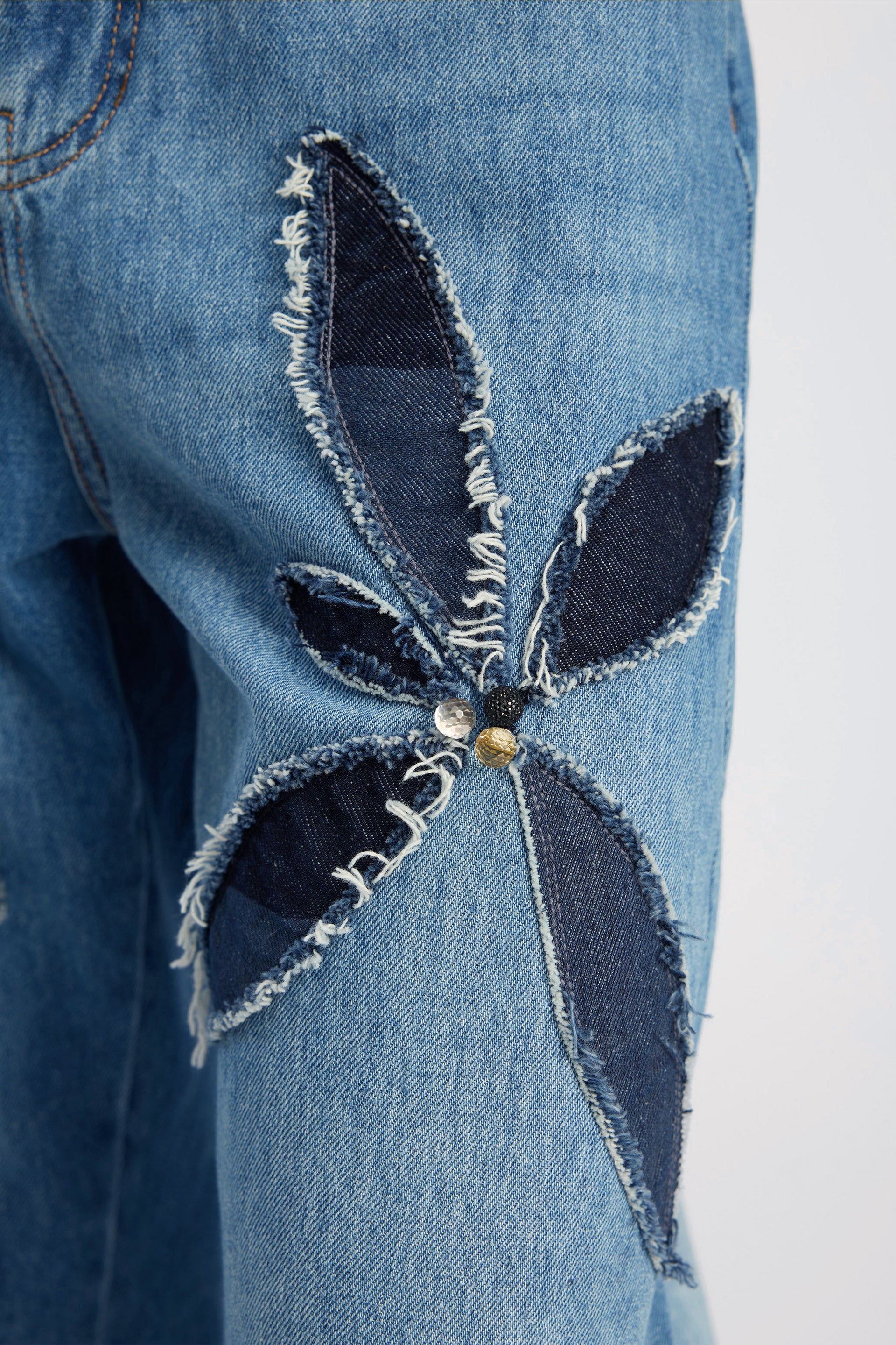 Bimo Pants från Munthe är ett par jeans med stora applicerade blommotiv på benen, skurna i kontrasterande denim. Byxorna har en boyfirendpassform med raka ben och lös midja.