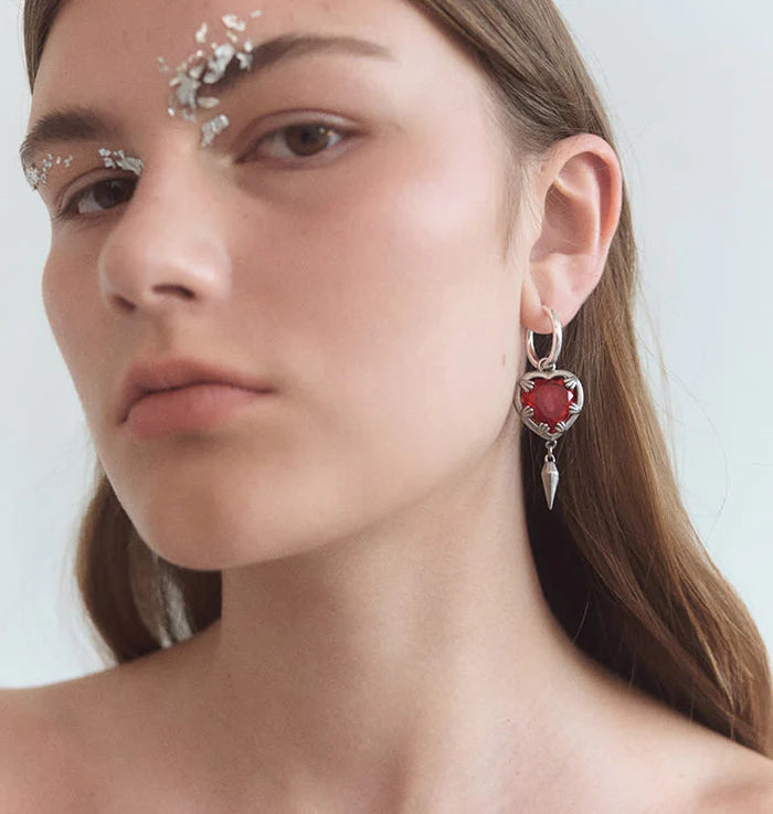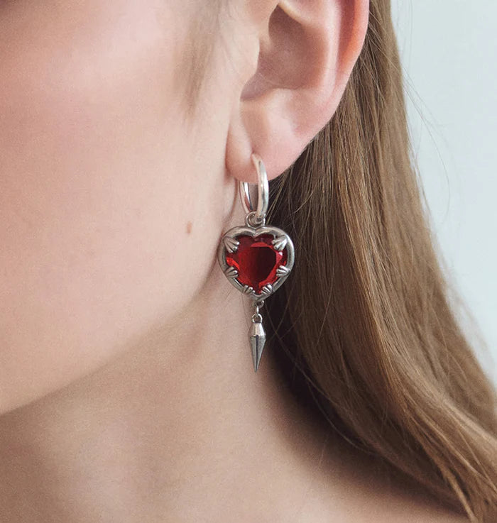 Claw Heart Big från WOS är ett par örhängen med ett rött hjärta i glas som hålls på plats av kloliknande infattning. Hjärtat hänger i en slät creol och har en spetsformad spike detalj under sig.