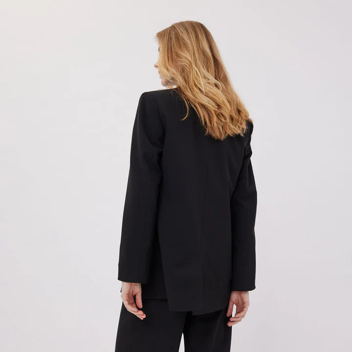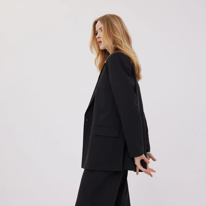 Frida 285 från Five Units är en oversized dubbelknäppt kavaj med små axelvaddar, framfickor med lock, logotypknappar och slits bak. En klassisk kavaj som är ett givet inslag i varje garderob!