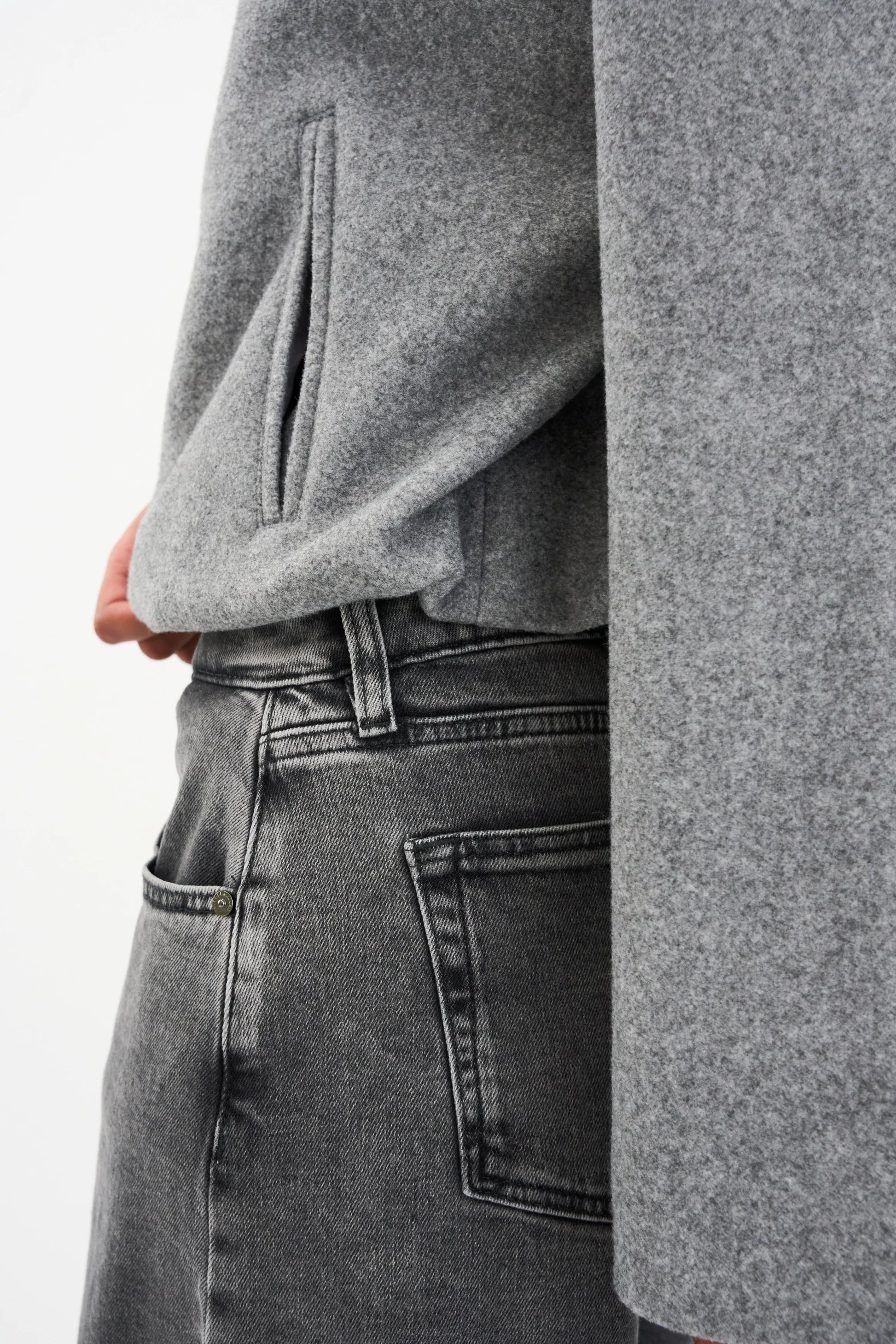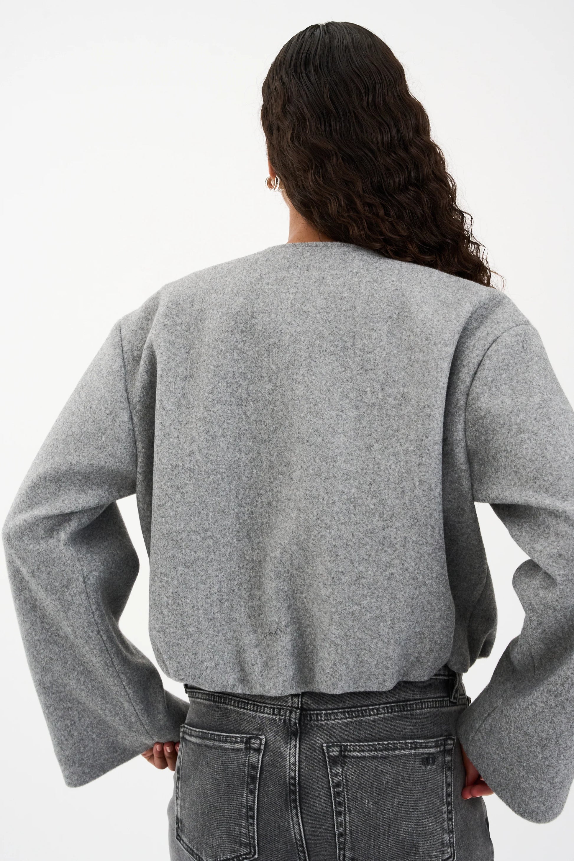 Adaleide Bomber från Ivy Copenhagen är en jacka i ett strukturerat gråmelerat tyg. Jackan har en kort, boxig siluett med vida ärmar och en skarp rund halsringning.