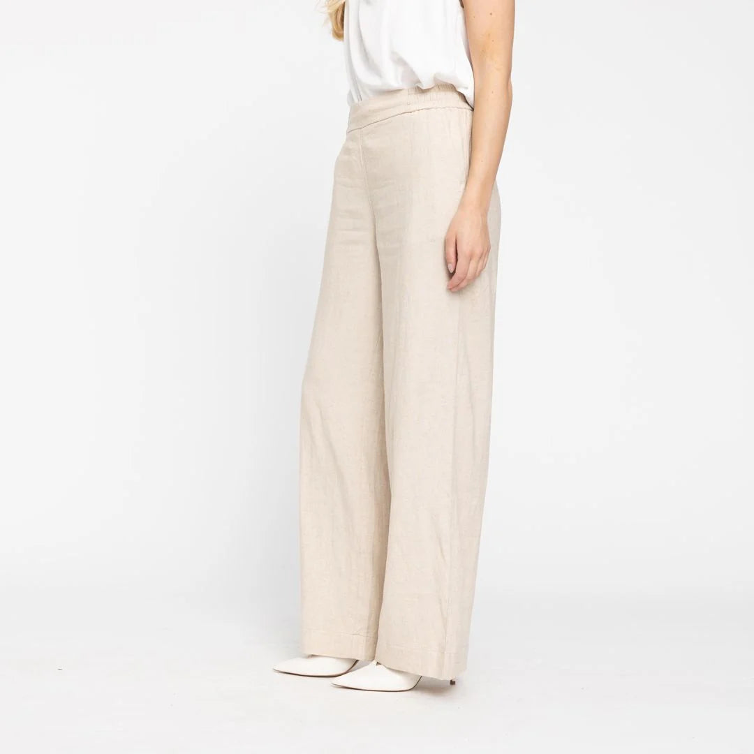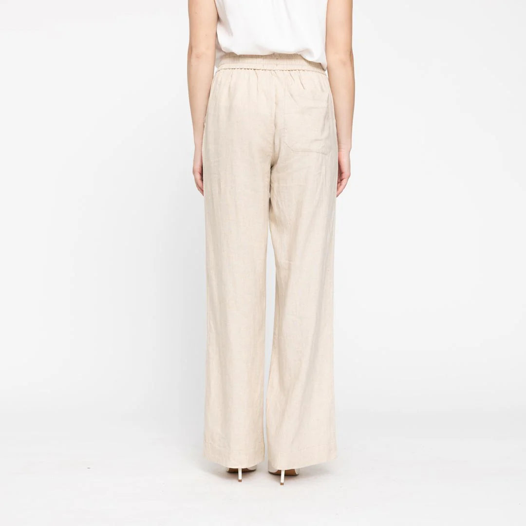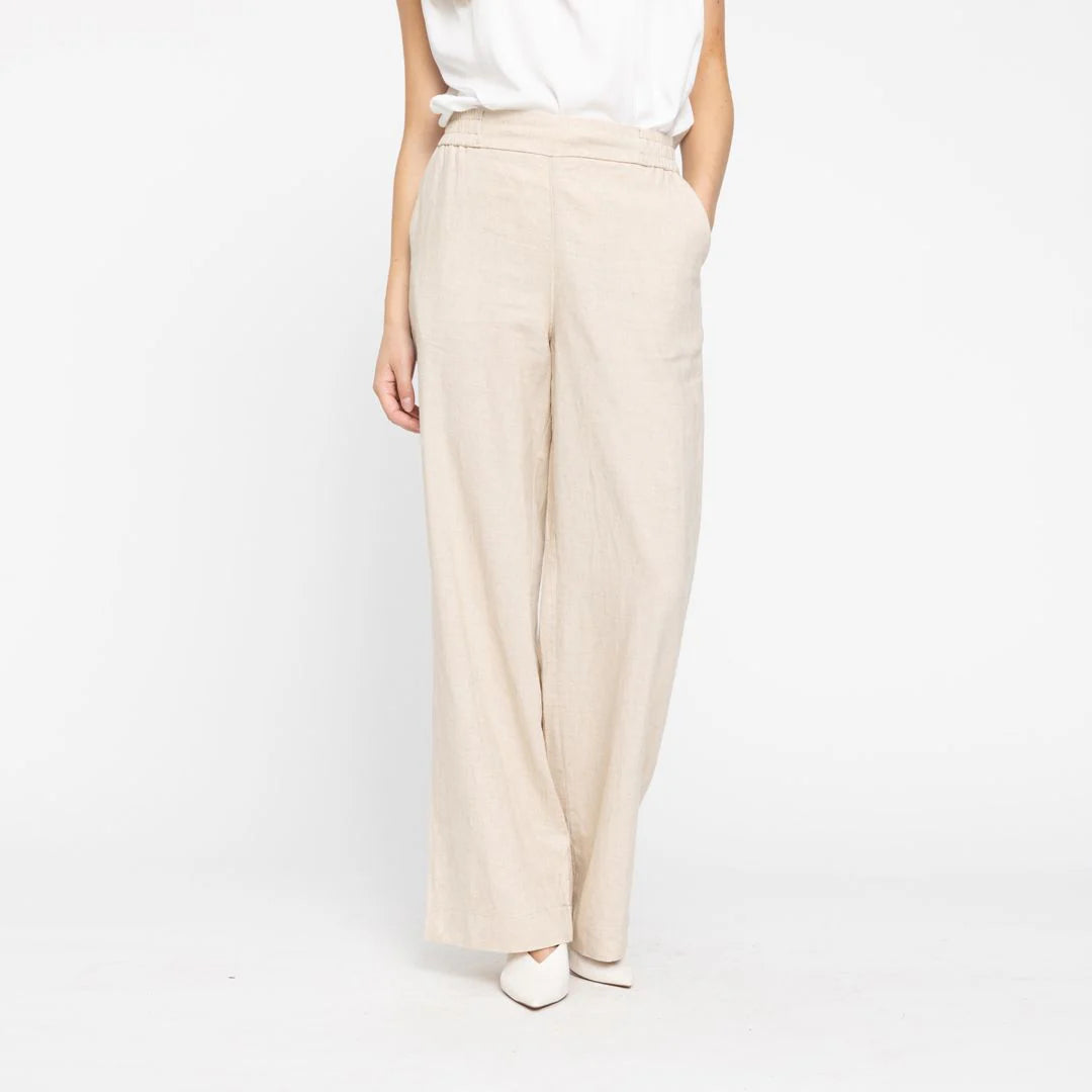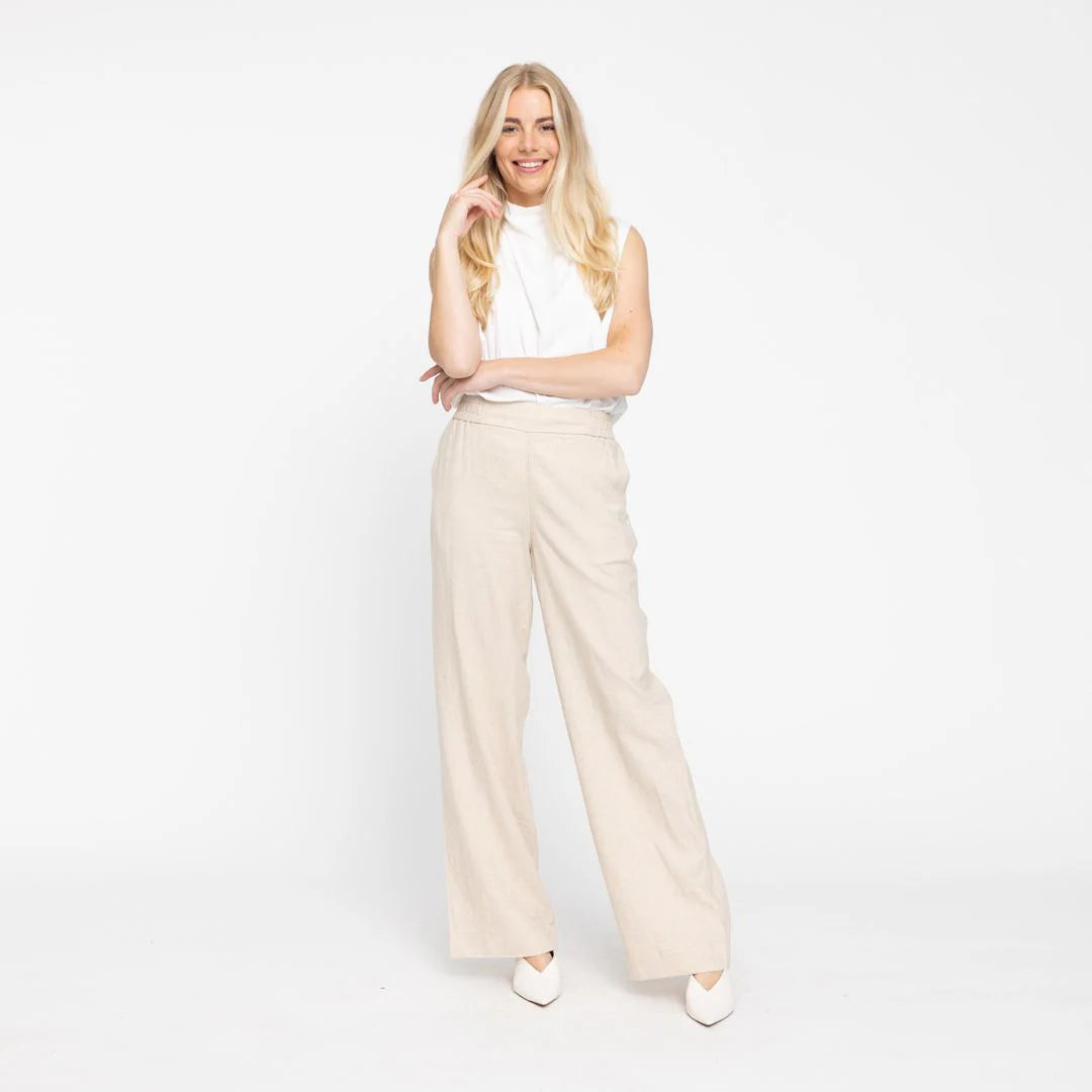 Linea 763 från Five Units är en beige linnebyxa med lös passform, resår i midjan samt sidofickor och en bakficka. Passar fint att bära tillsammans med en krispig skjorta.