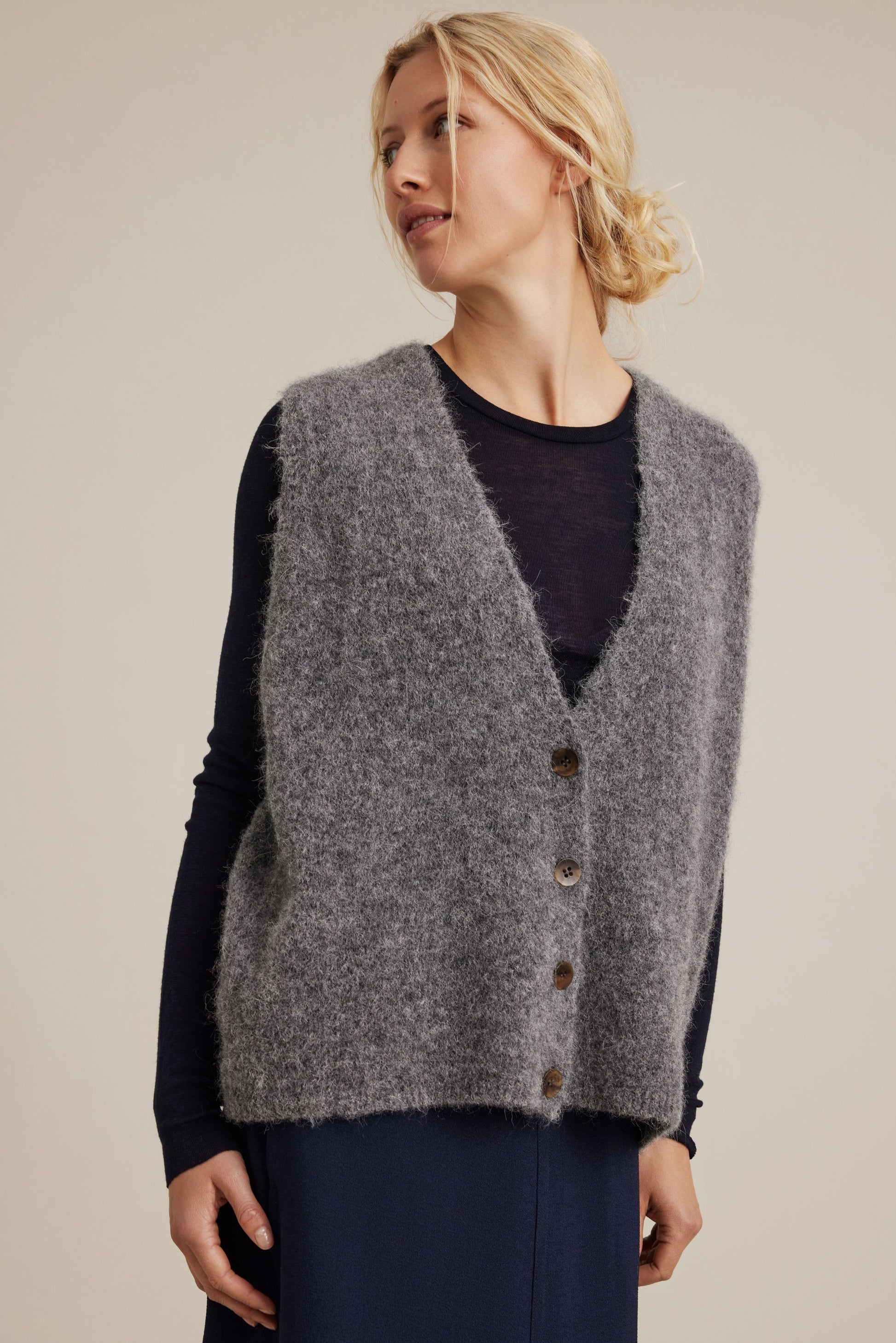 Mitte från Sibin Linnebjerg är en stickad väst i mjuk alpackablandning. Västen har v-ringad hals och knäppning framtill.