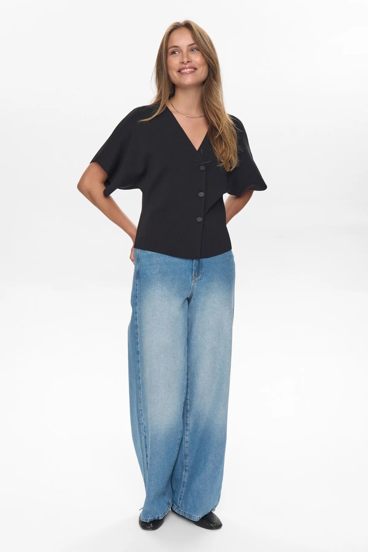 Nulonna Cardigan från Nümph är en blus med knappar framtill, v-ringad hals och korta vida ärmar.