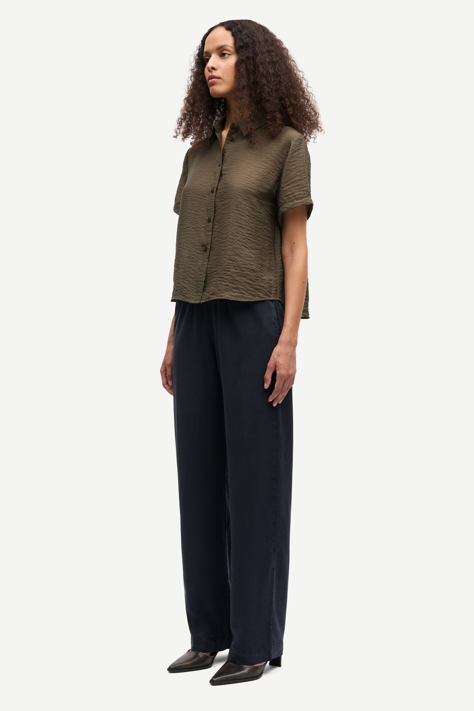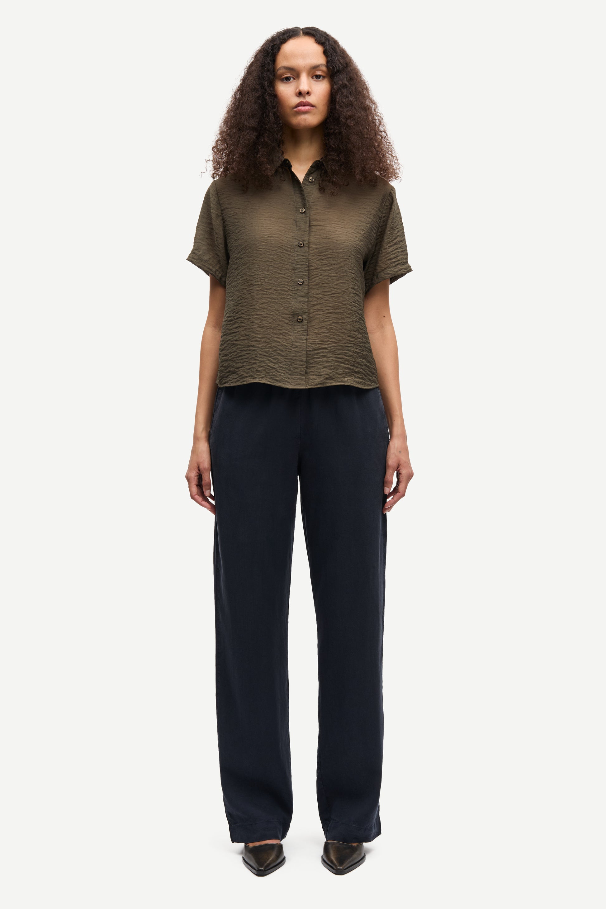 Saminna SS Shirt från Samsøe Samsøe är en kortärmad skjorta med avslappnad passform, knäppning framtill och veckad detalj i ryggen.