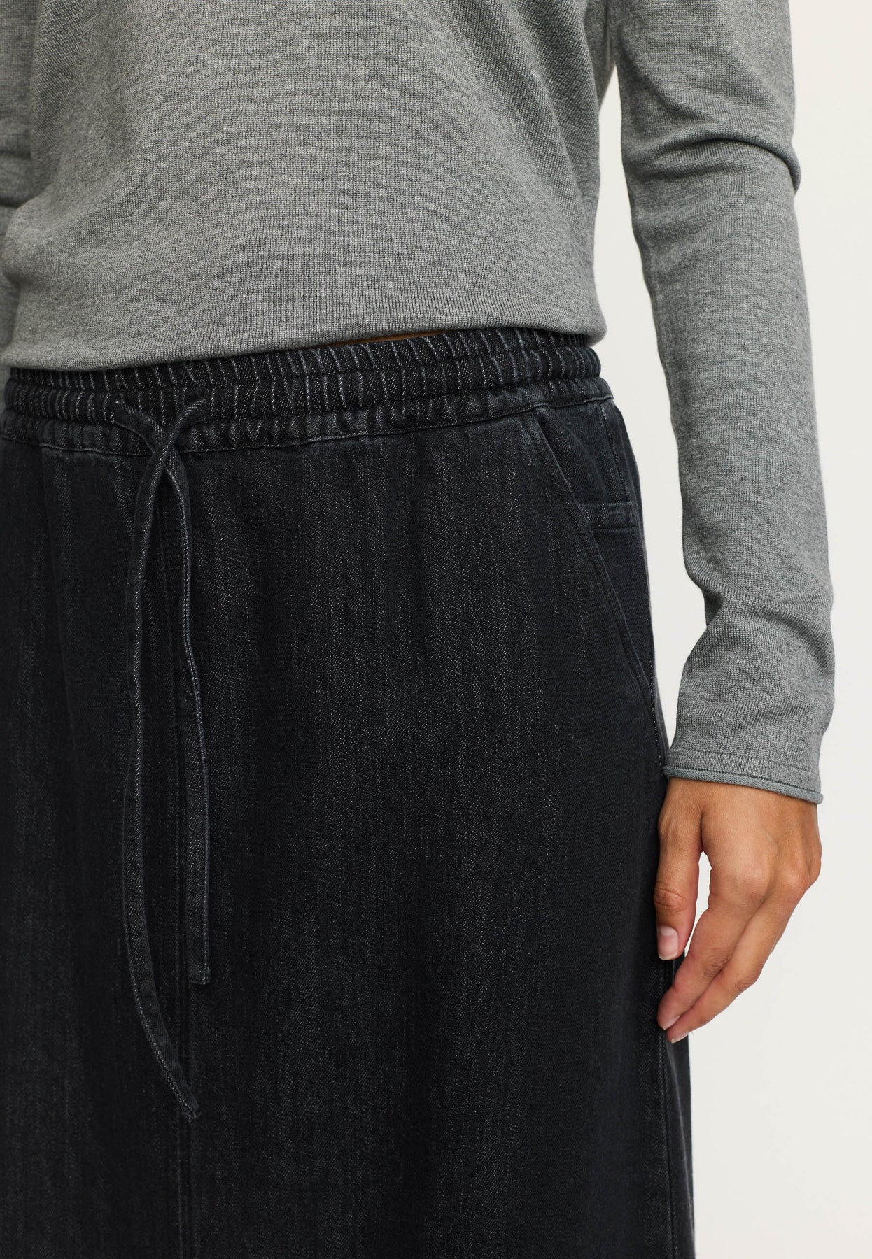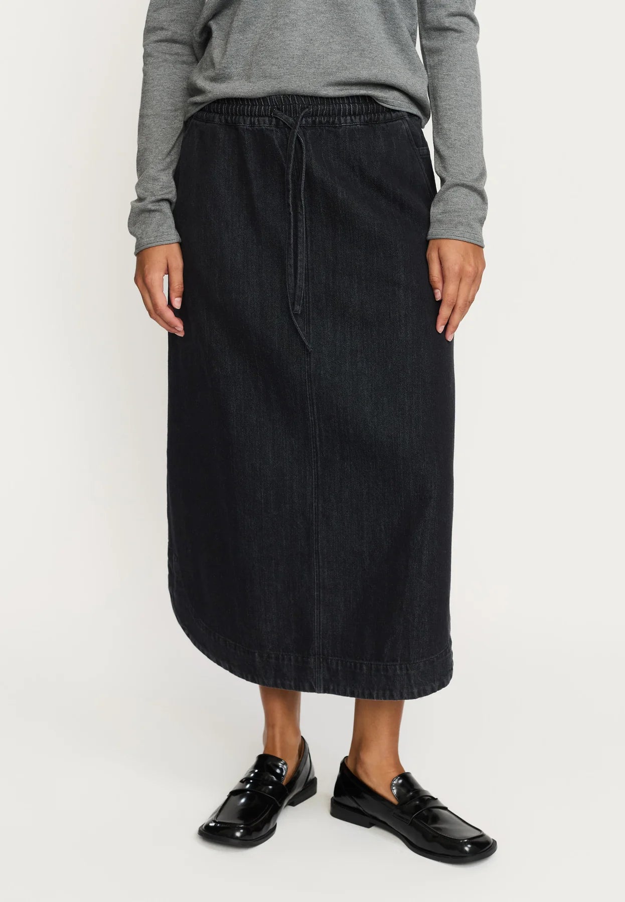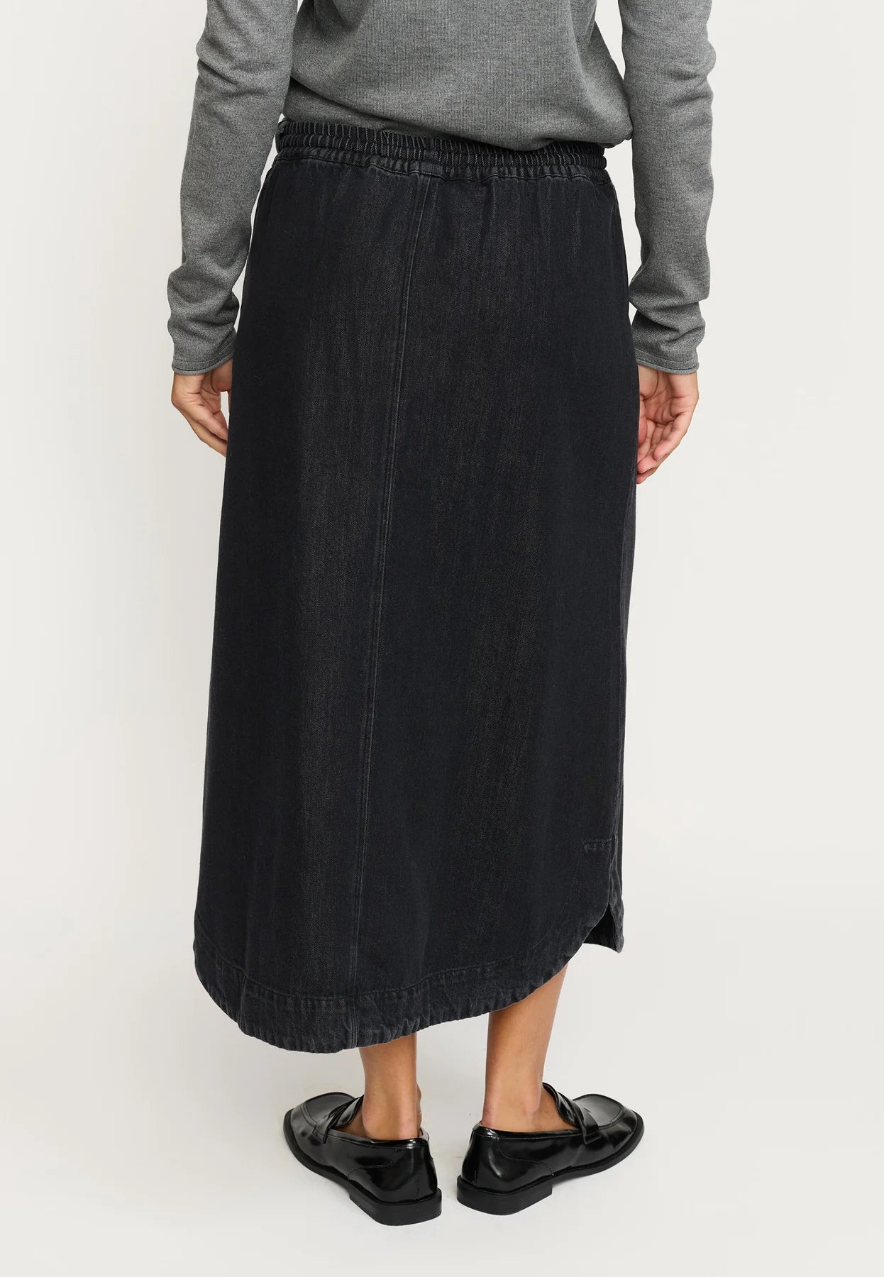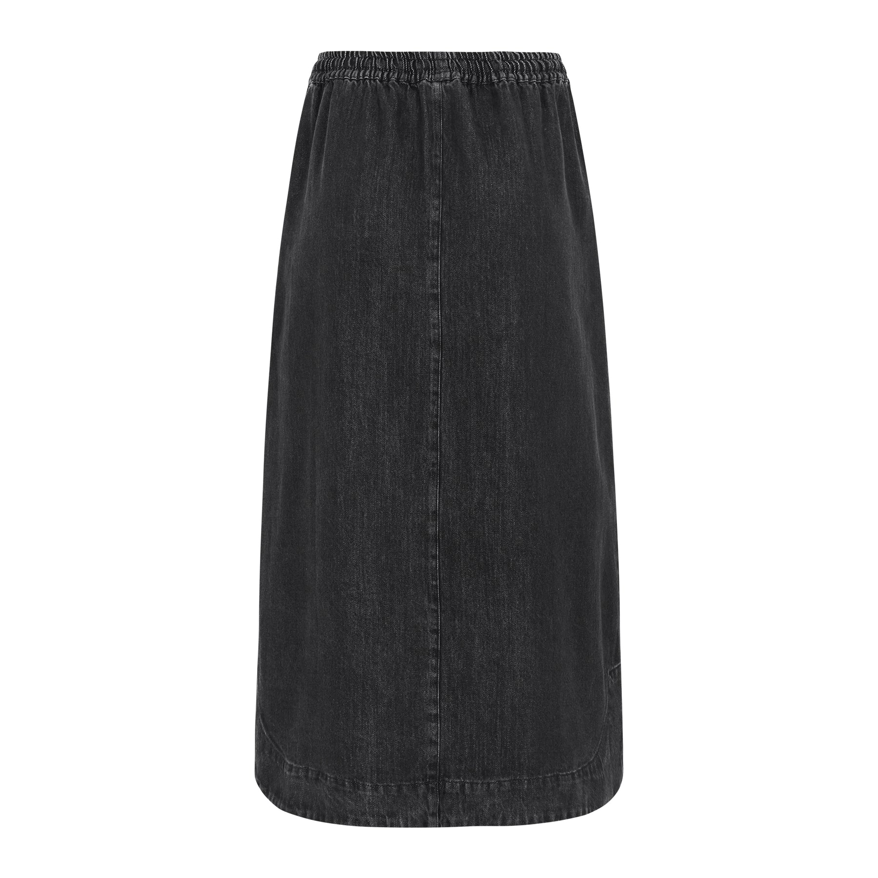 SRKeira Skirt från Soft Rebels är en kjol i tvättat svart denim med resår i midjan och rundad fåll.