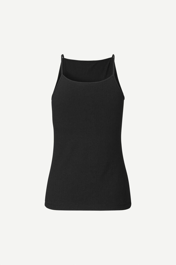 Stinna Top från Samsøe Samsøe i svart. Linnet har slimmad passform, tunna axelband samt hög och rak urringning. Ett måste i basgarderoben som passar till det mesta!