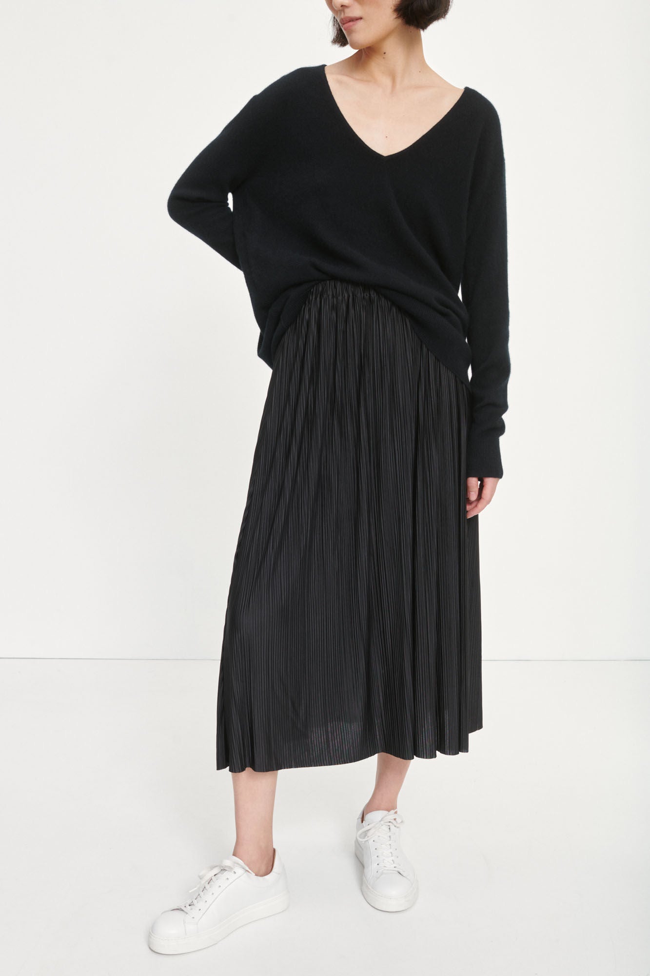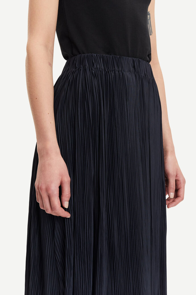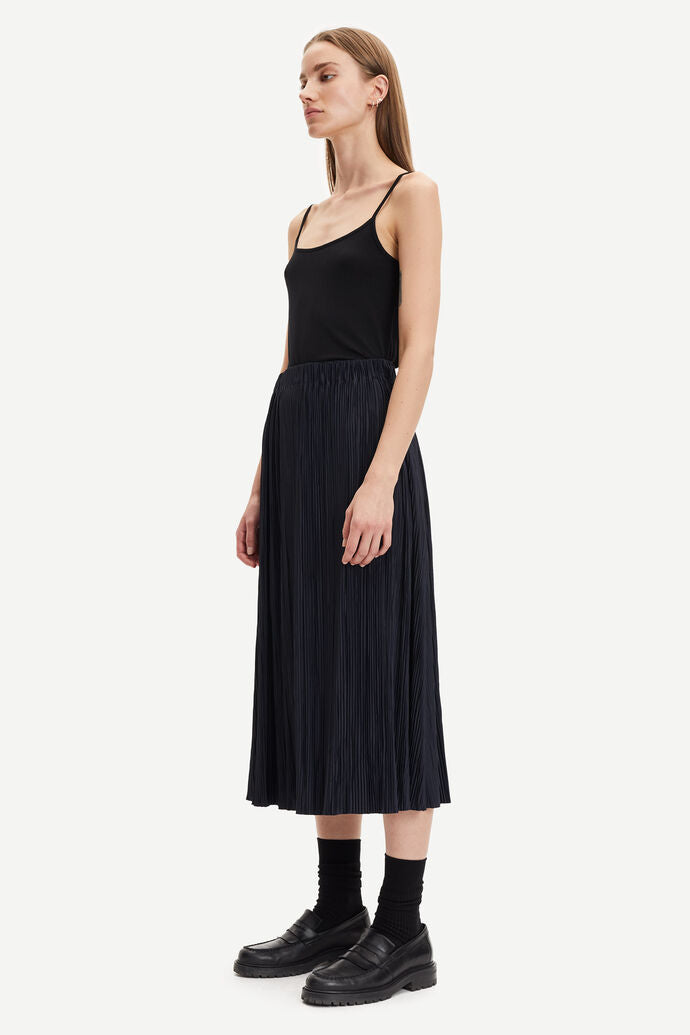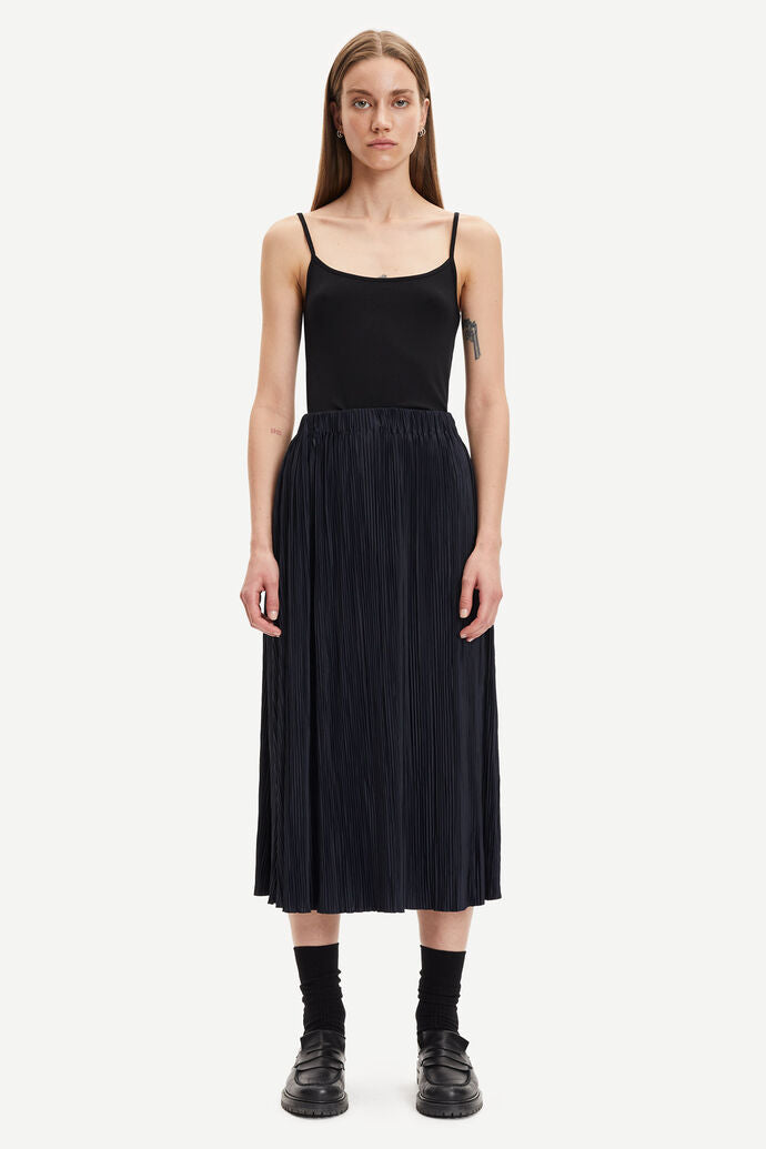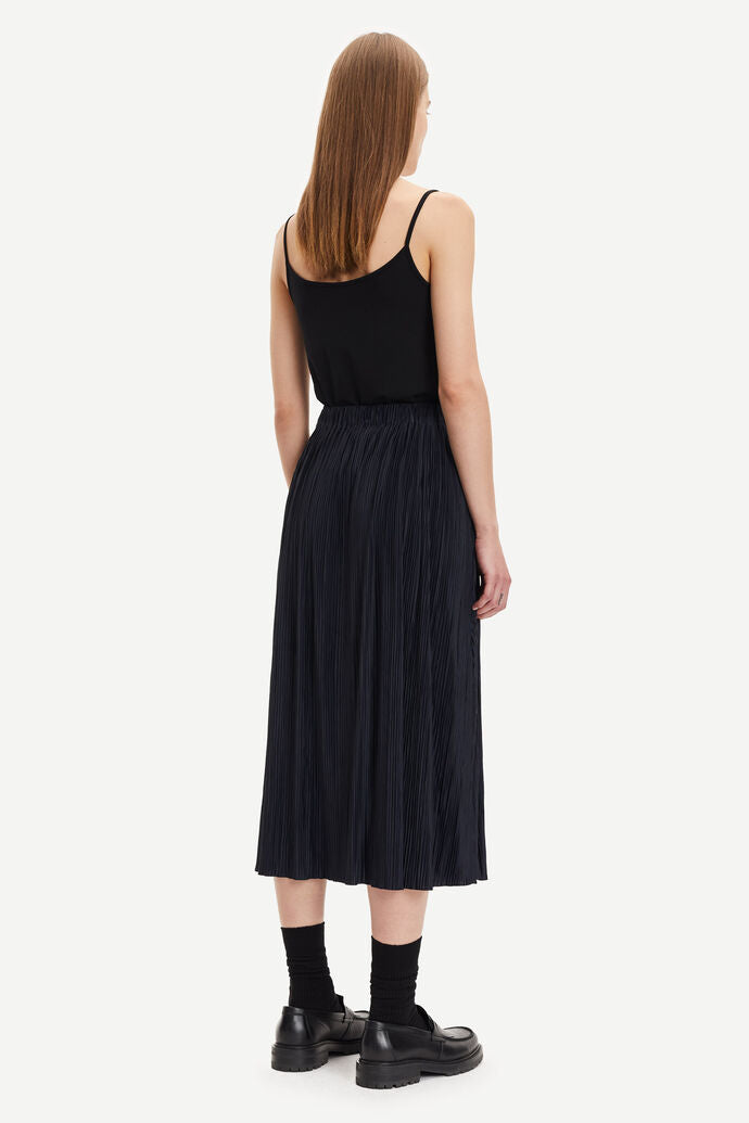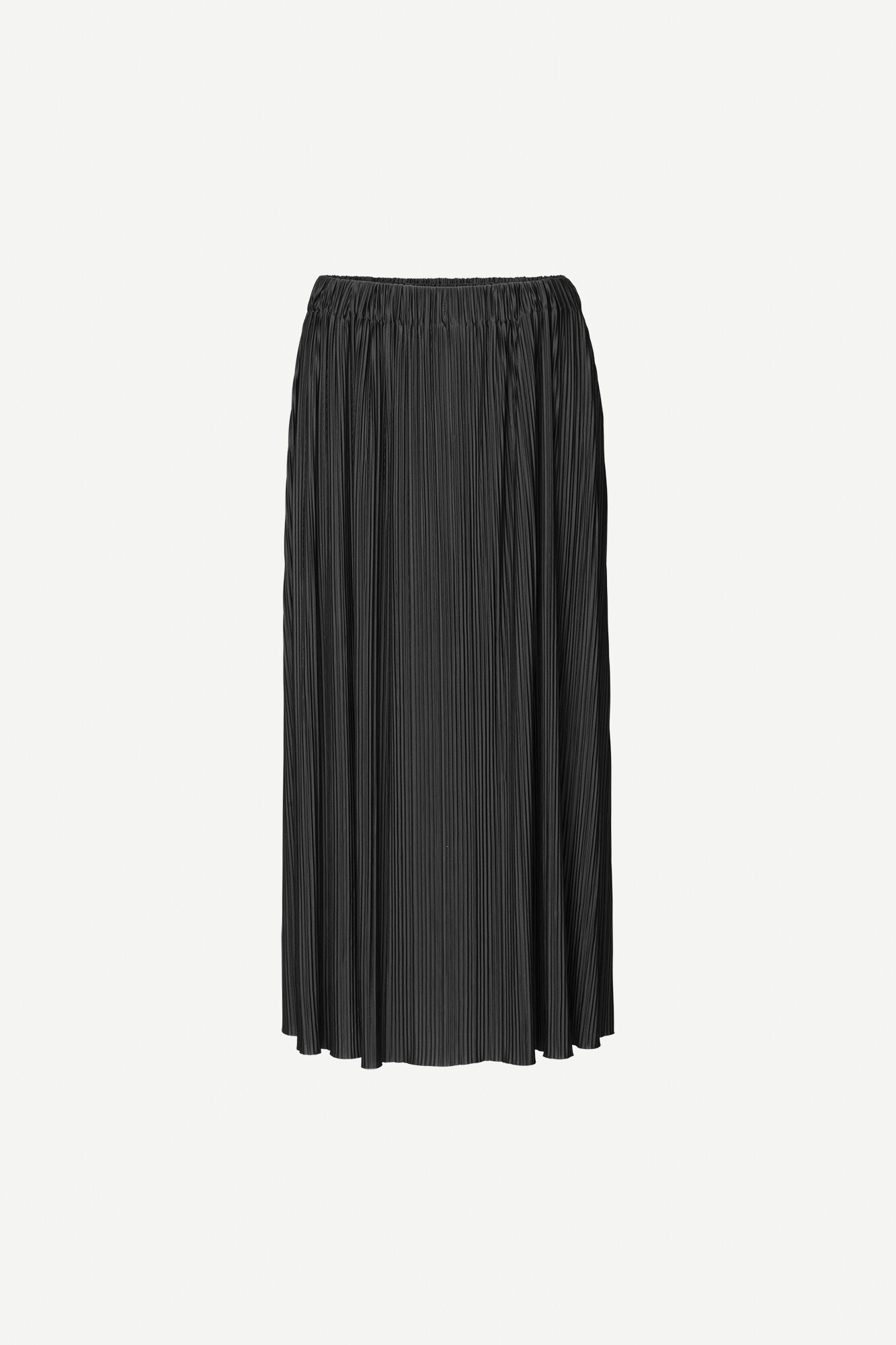 Uma från Samsøe Samsøe är en snyggt plisserad kjol i svart. Kjolen har resår i midjan och har ett fint tungt fall. Styla gärna med stickade plagg eller en fin topp för en festligare look.